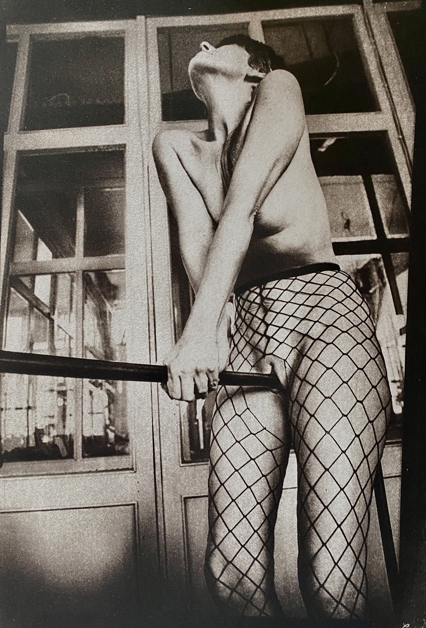 une danseuse en bas résille, à cheval sur la barre qui écarte les lèvres de sa vulve