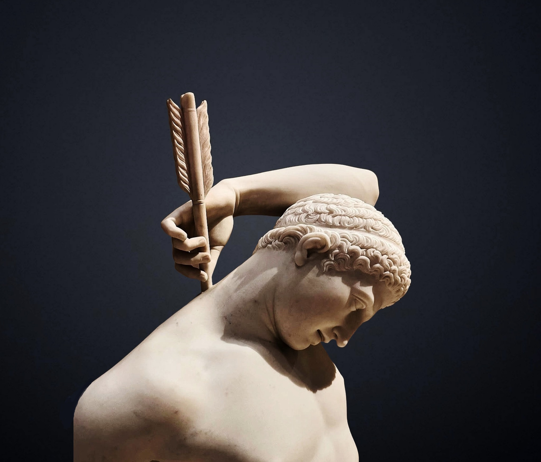 alt : un jeune dieu, la tête inclinée, saisit par dessus son épaule la flèche plantée dans le haut de son dos