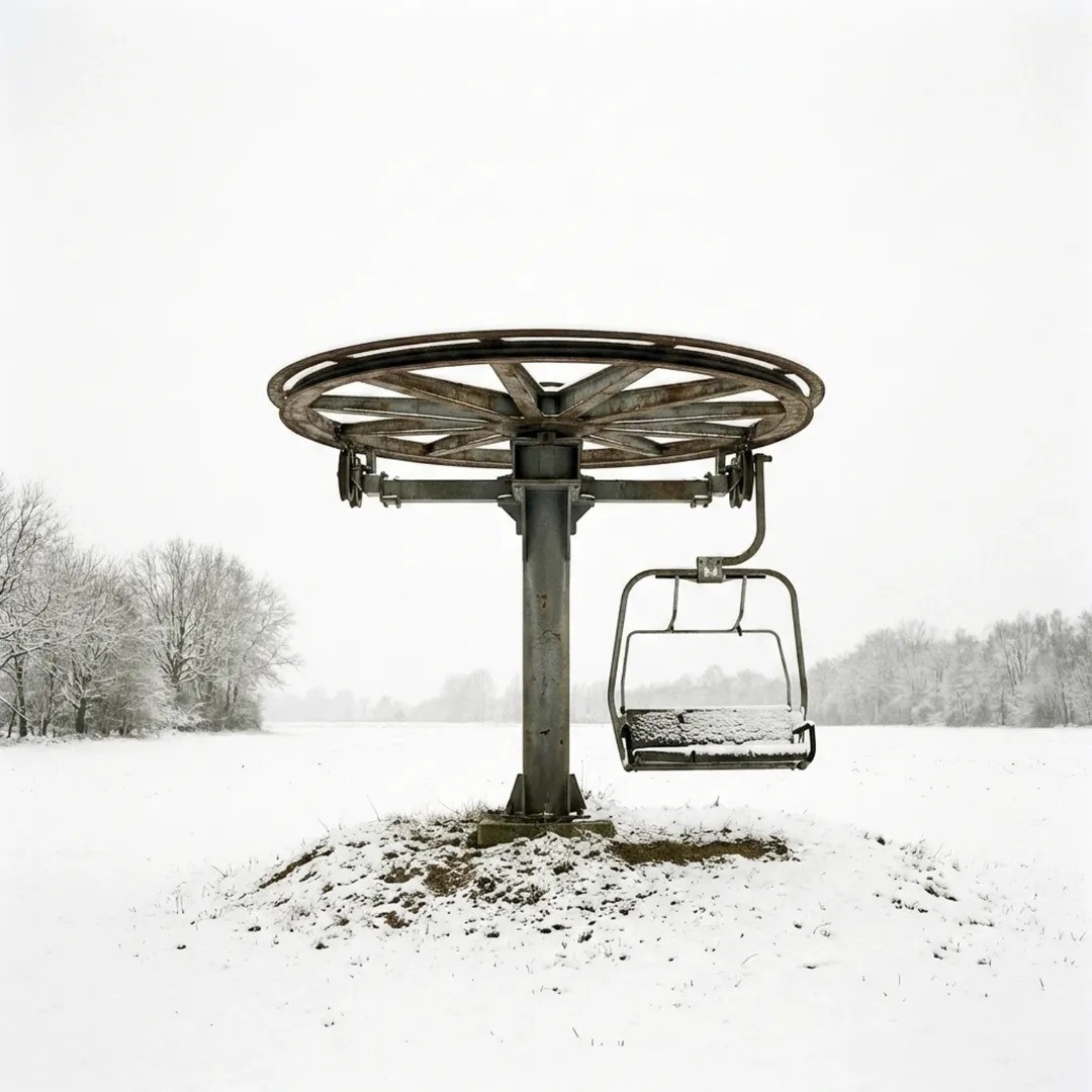 alt : comme un manège installé en plein champ sous la neige, un pylône sans câble auquel un siège unique de télésiège est suspendu