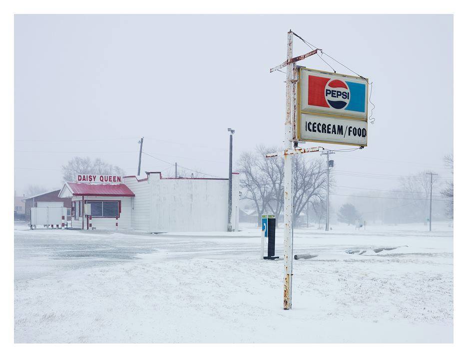 alt : à un carrefour désert dans un paysage glacial d’hiver, le petit magasin d’un marchand de glace américain