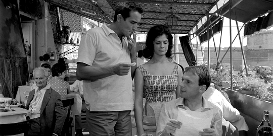 alt : Vittorio Gassman introduit de la nourriture dans la bouche de Jean-Louis Trintignant, installé à la terrasse d’un restaurant