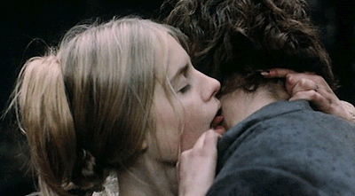 alt : une jeune femme passe la pointe de sa langue sur le cou d’un jeune homme
