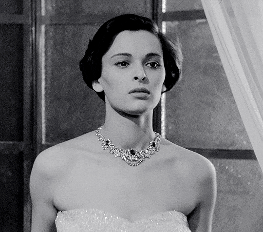alt : une femme, épaules nues et portant un luxueux collier de pierres précieuses cherche du regard quelque chose d’autre