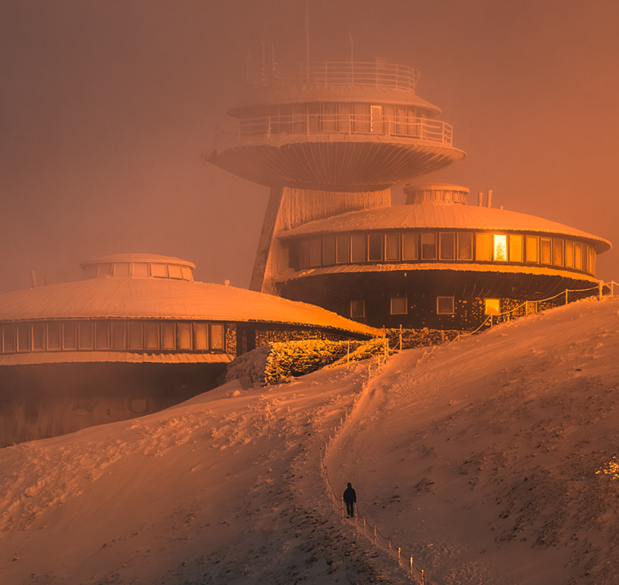 alt : un homme se dirige dans la neige sous le soleil levant vers la frontière où les bâtiments circulaires de l’observatoire météorologique de haute montagne Tadeusz Hołdys, composante de l’Institut de météorologie et de gestion de l’eau de Pologne, située à 1602 m sur la Sniejka, la plus haute montagne des monts des Géants et des Sudètes, sont posés comme des soucoupes volantes
