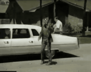 alt : devant une limousine blanche, un homme portant un masque de catch esquisse quelques pas de danse