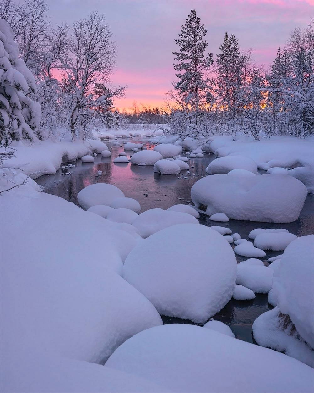 un ruisseau serpente dans la neige, reflétant les roses du ciel