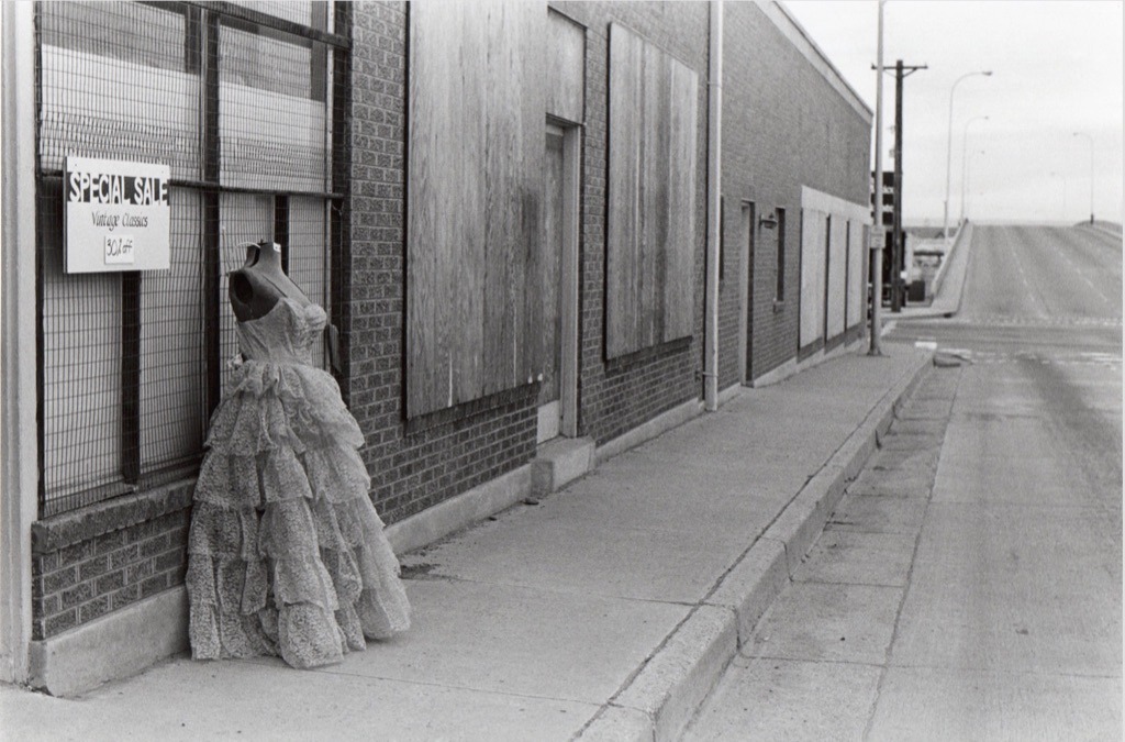 alt : une robe de soirée soldée sur le trottoir d’une ville abandonnée