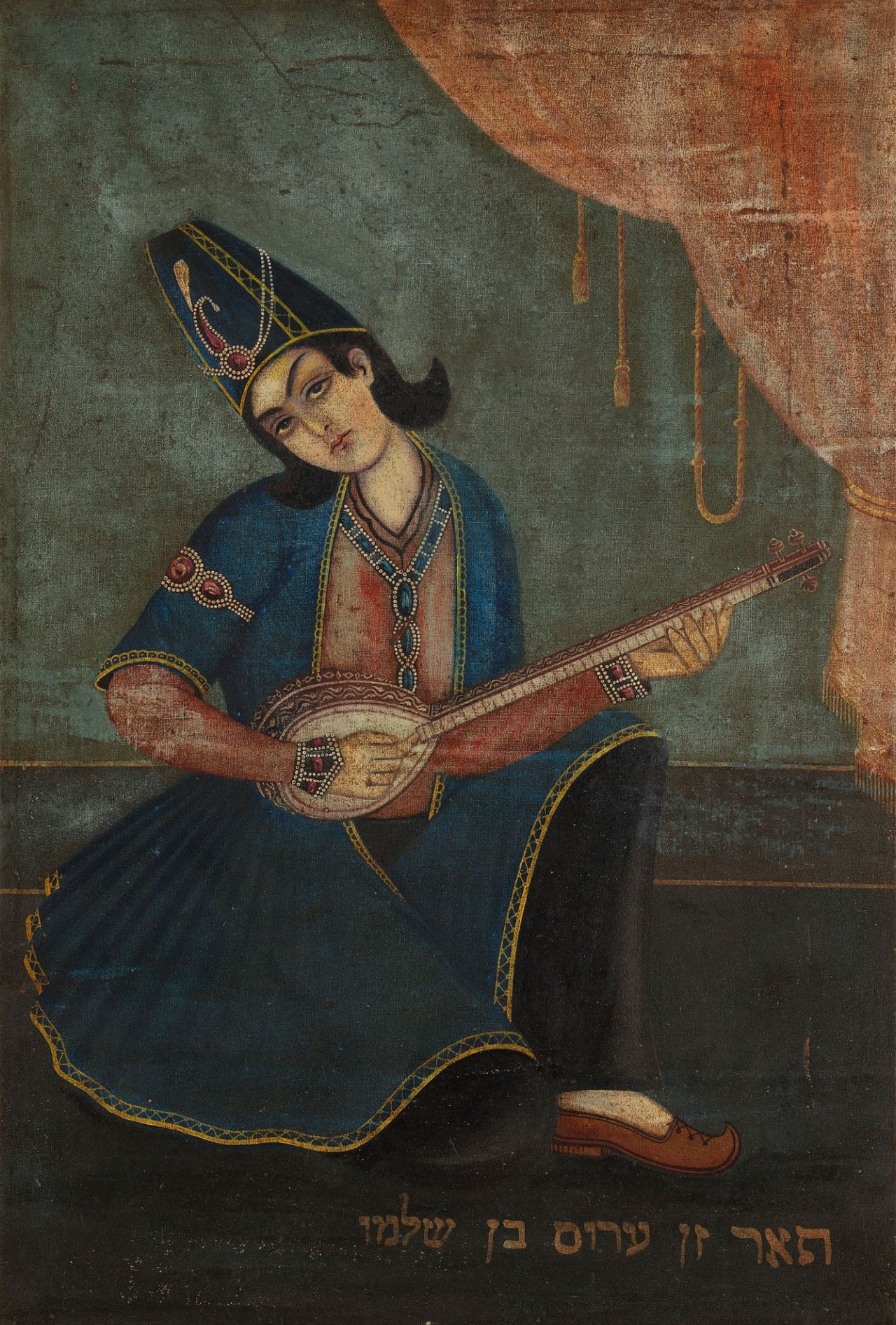 Certaines des réalisations les plus remarquables de la longue histoire de la production artistique persane ont vu le jour sous la dynastie Qajar au XIXe siècle. Bien que l’art persan soit souvent associé, dans l’imaginaire collectif, à des miniatures complexes et à d’autres arts décoratifs luxueux, l’esthétique de l’époque Qajar privilégiait les grands formats, les couleurs éclatantes et l’adoption de nouvelles techniques visuelles. Dans cette tradition, les représentations de sujets juifs sont extrêmement rares, ce qui rend ce portrait saisissant d’Arus jouant du tar particulièrement remarquable. Plus qu’un simple portrait, il témoigne avec force de la rencontre entre la culture visuelle Qajar et le vécu des communautés juives d’Iran, offrant un aperçu d’un monde rarement représenté dans la peinture persane.