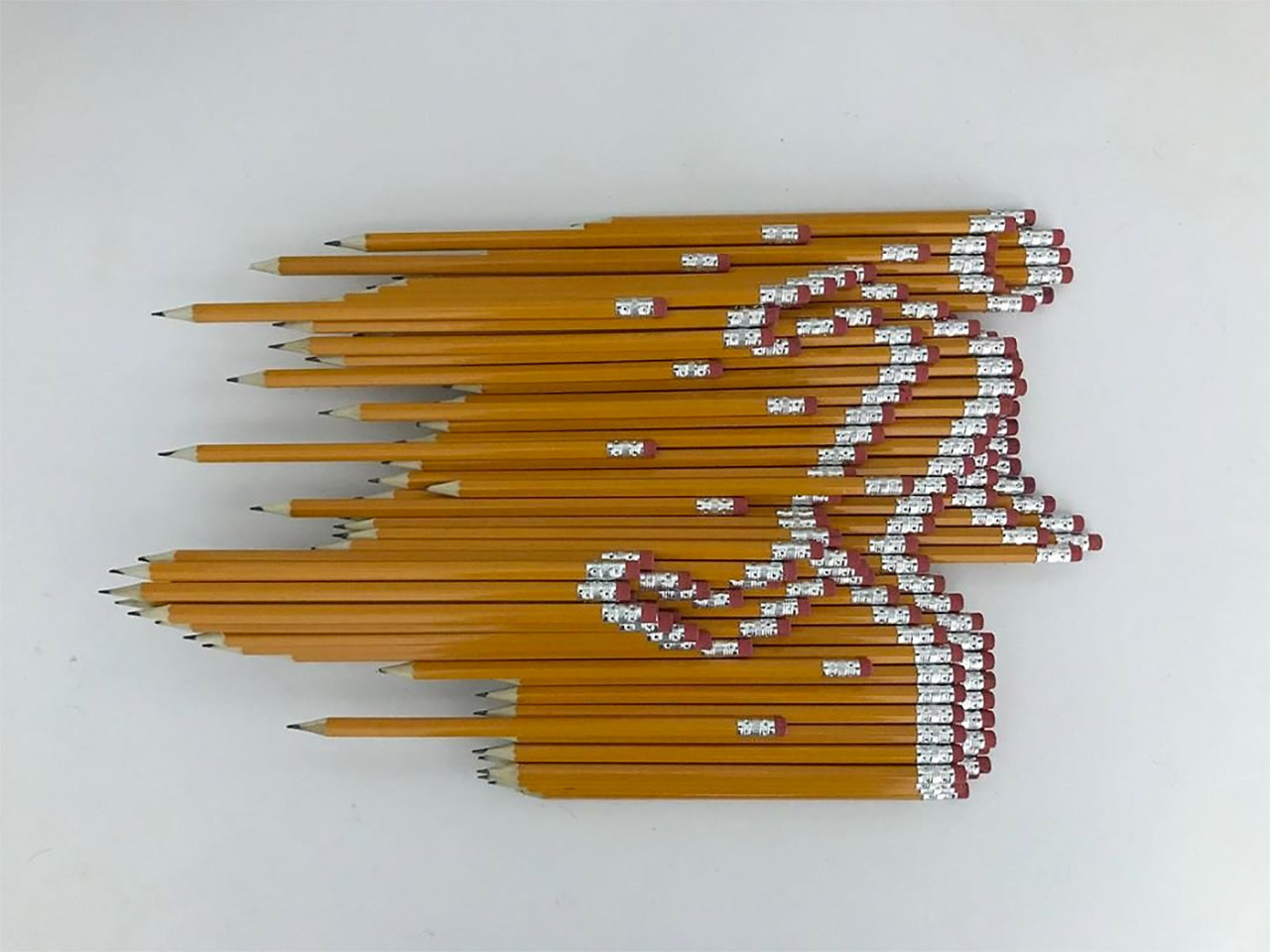 alt : une silhouette humaine en pleine course dessinée par les bagues de métal fixant la gomme d’une centaine de crayons à papier décalés