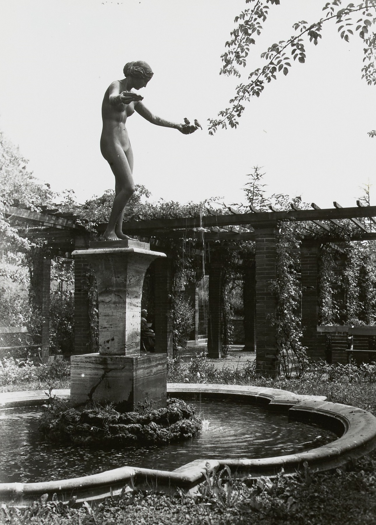 alt : au centre d’un bassin, une statue de femme aux bras ouverts dans un jardin, des oiseaux posés sur ses mains