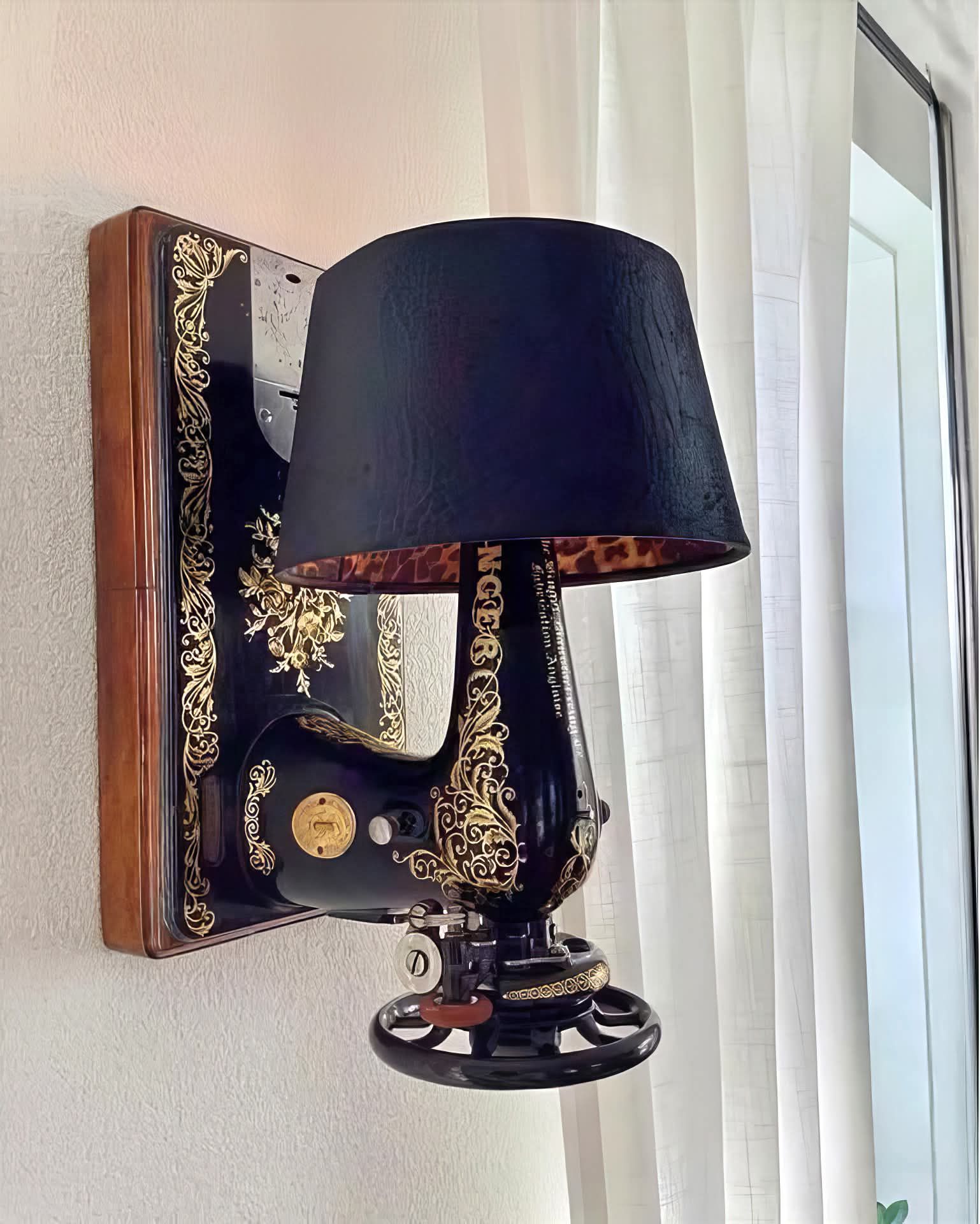 A vintage Singer sewing machine head repurposed as a wall sconce with a sleek black fabric shade
