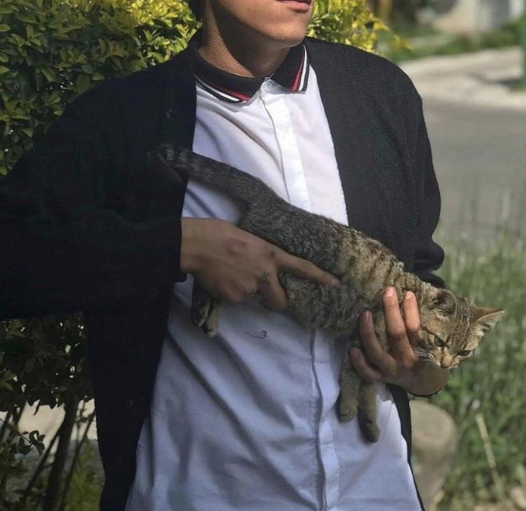 alt : un jeune en blazer radicalisé tenant un félin de guerre en terrain minet