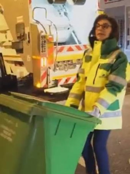 alt : photographie de Mme Dati à l’aube dans les rues de la capitale, ayant déjà rebondi et rejoint les équipes de Propreté de Paris – Collecte des déchets