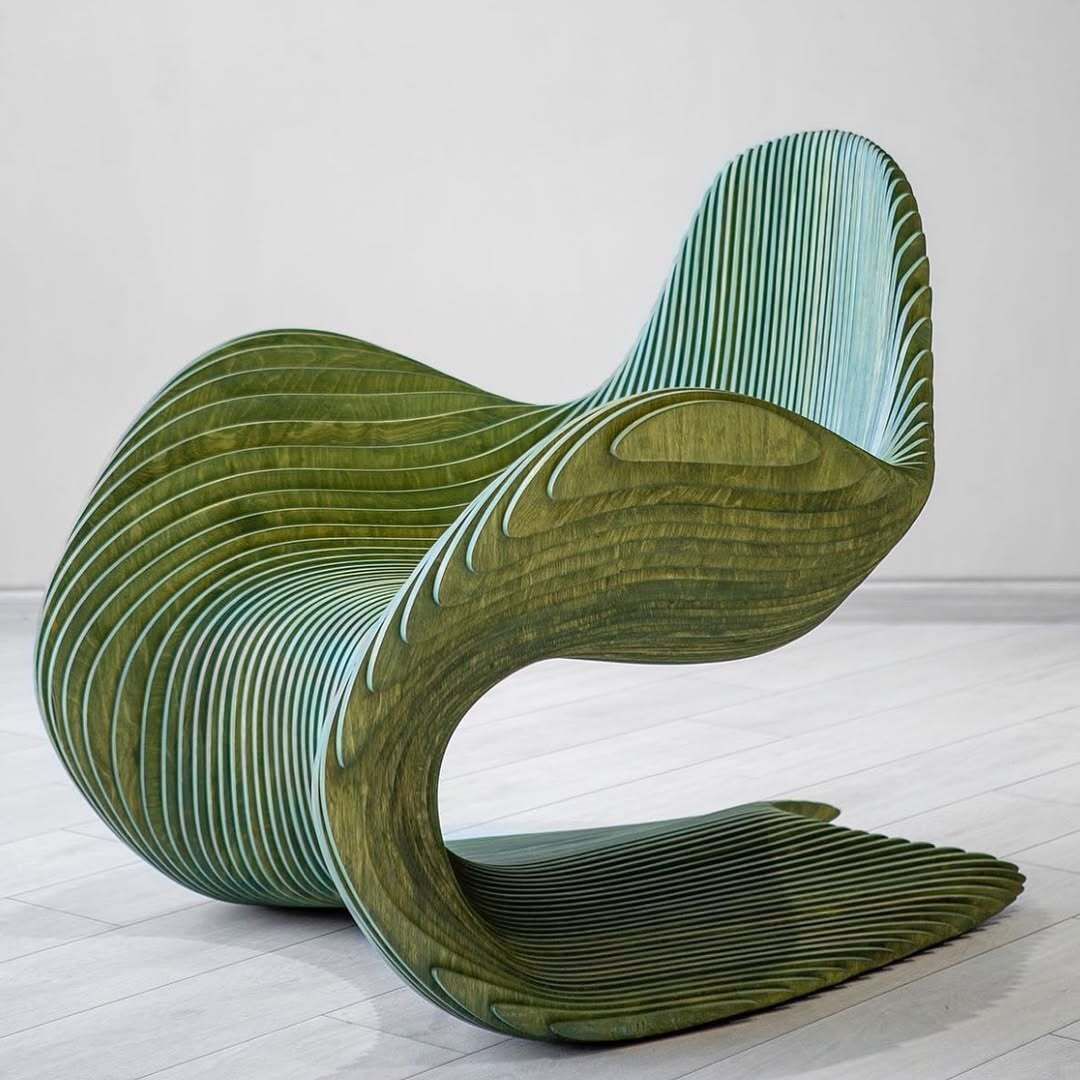 alt : chaise sinueuse en pli de bouleau rainurée comme le ventre d’une baleine à bosse