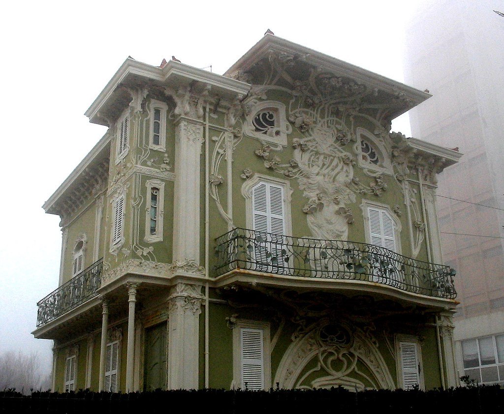 alt : dans la brume, une maison de style Art Nouveau aux volets clos